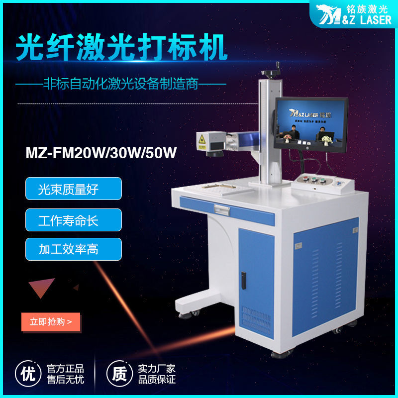 MZ-FM-20/30/50/100W-R光纖激光打標機是我公司運用現今世界上先進的激光技術研制而成的新一代激光打標機系統。采用武漢銳光纖輸出激光,再經高速掃描振鏡系統實現打標功能。光纖激光打標機電光轉換效率高,達到30%以上,采用風冷方式冷卻,整機體積小巧,輸出光束質量好,可靠性高??傻窨探饘俨牧虾筒糠址墙饘俨牧希饕獞糜趯ι疃取⒐饣?、精細度要求較高的領域,如鐘表、首飾、模具行業,位圖打標等。